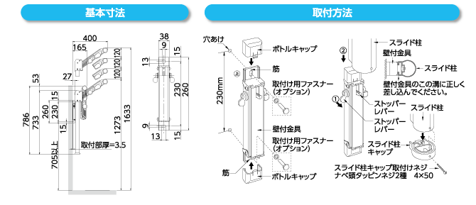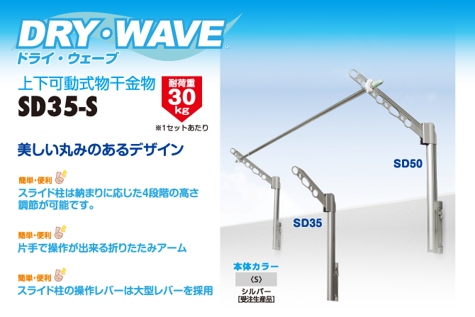 丸みのあるスライド柱とアームを一体化させたデザイン。スライド柱の高さは3段階、間口が小さい時のアームショートタイプ。片手で操作が出来る折りたたみアーム・スライド柱のレバーも左右どちらからでも操作が可能なスタイリッシュなSD35。