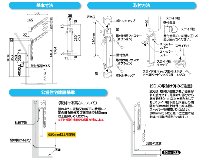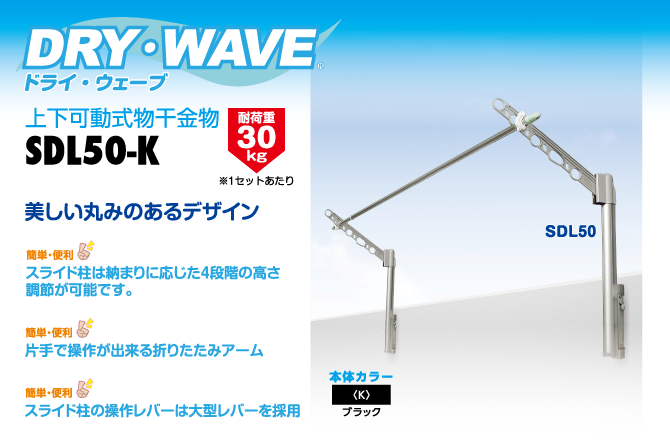 丸みのあるスライド柱とアームを一体化させたデザイン。スライド柱の高さは3段階、アームの長さはスタンダート。取付け位置が低い時に。片手で操作が出来る折りたたみアーム・スライド柱のレバーも左右どちらからでも操作が可能なスタイリッシュなSD50。