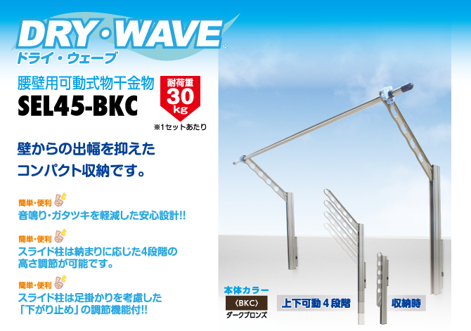壁からの出幅を抑えたコンパクト収納。スライド柱の高さは4段階可能、間口の小さい時のアームショートタイプ。取付位置が低い時に。片手で操作が出来る折りたたみアーム・スライド柱のレバーも左右どちらからでも操作が可能。音鳴り・ガタツキを軽減し安心設計のSEL45。
