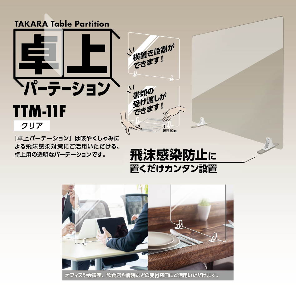咳やくしゃみによる飛沫感染対策にご活用いただける、透明なパーテーションです。 隣が気になったりプライバシーを守りたいときに最適です。 オフィスや会議室、飲食店や病院などの受付窓口に活用いただけます。